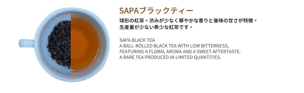 雲海がたなびく霧の町SAPAで、リーフを手摘みした高発酵茶。 渋みが少なく、甘みを帯びた紅茶です。生産量が少なく希少な紅茶。自然が生み出したフルーティーな香りと、後味の柔らかな甘みをお楽しみいただけます。